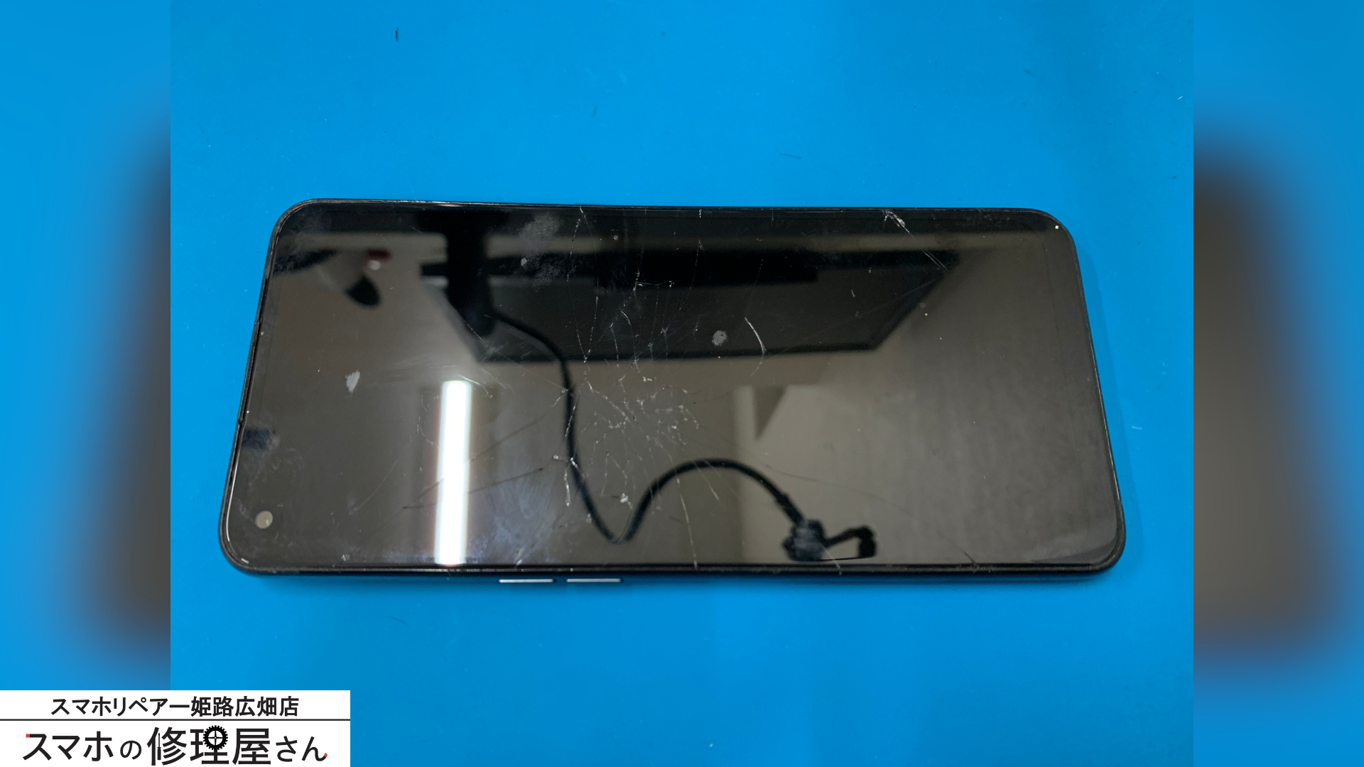 - 広範囲のひび割れ: 画面全体に細かなヒビが広がっており、指を滑らせると引っかかる危険な状態でした。