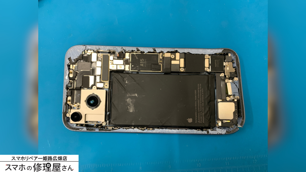 こんにちは! スマホリペアー姫路広畑店です! 今回は、iPhone 14の重度の損傷に対する包括的な修理事例をご紹介します。 画像のように、落下により背面パネルが粉砕し、内部のMagSafeコイルや基板の一部が見えている状態でお持ち込みいただきました。お客... -